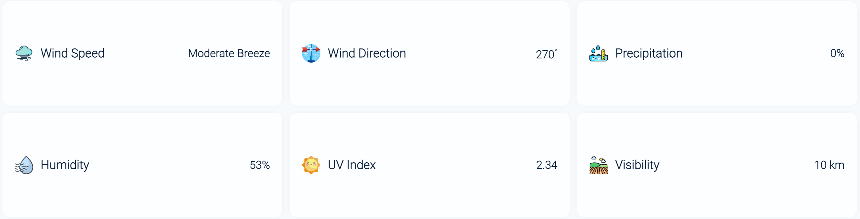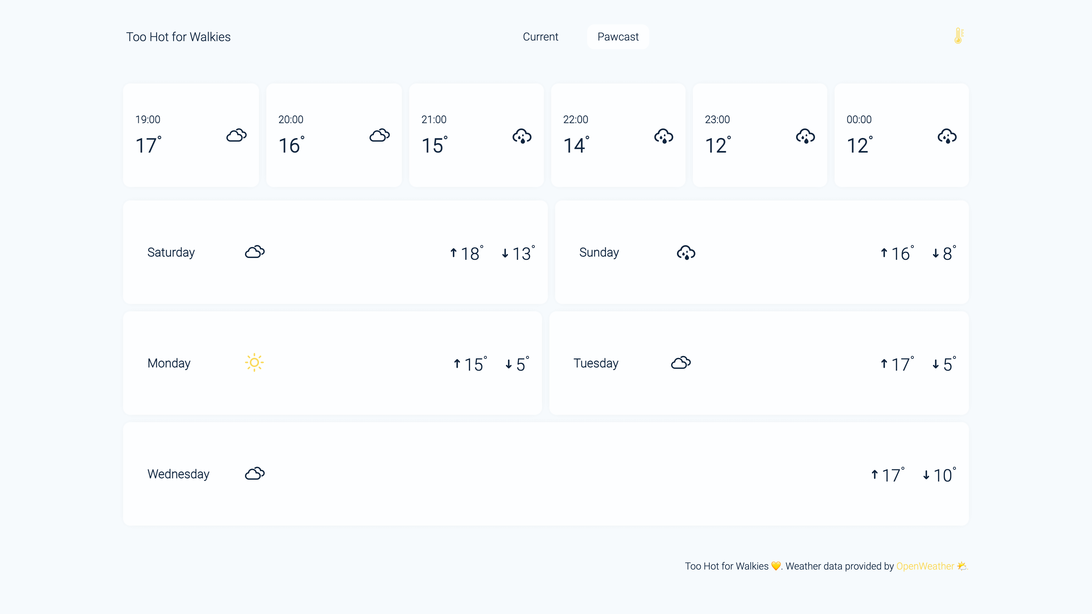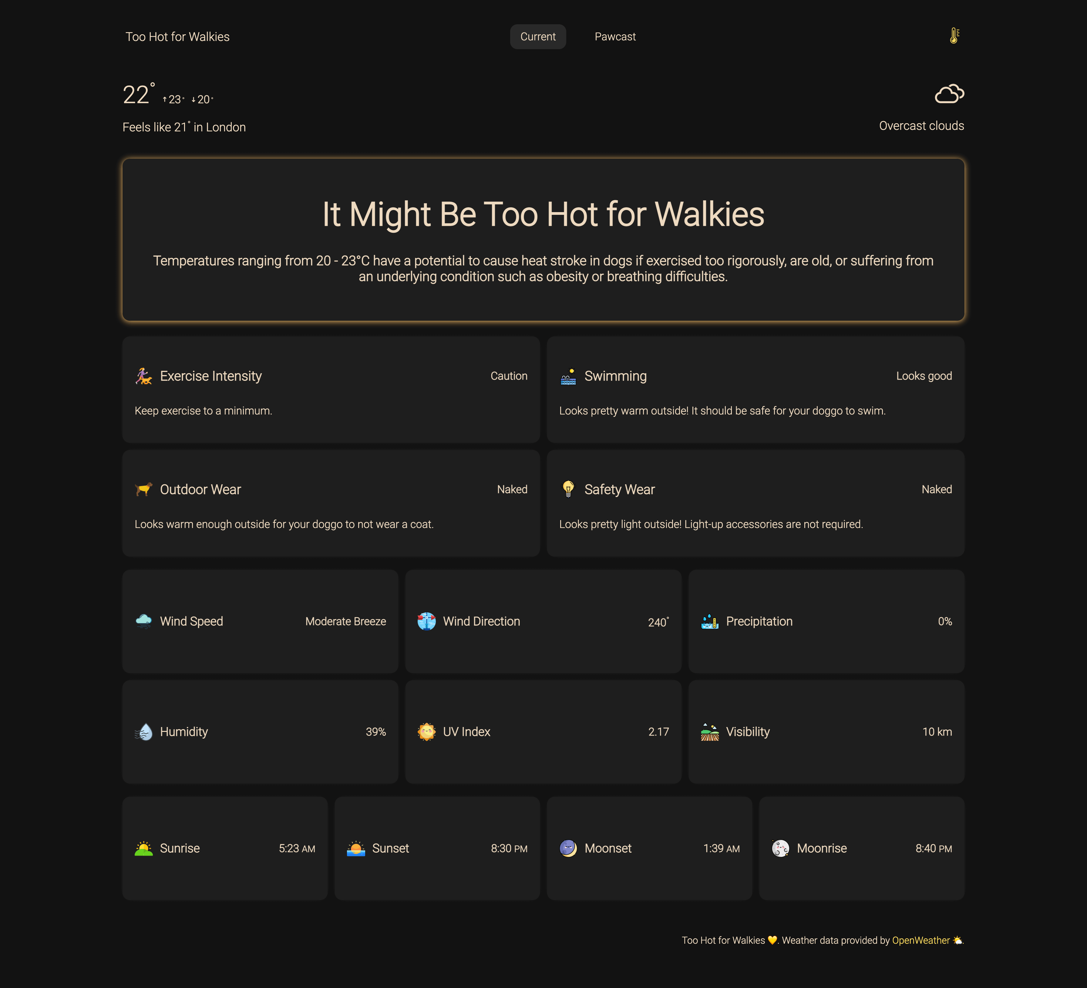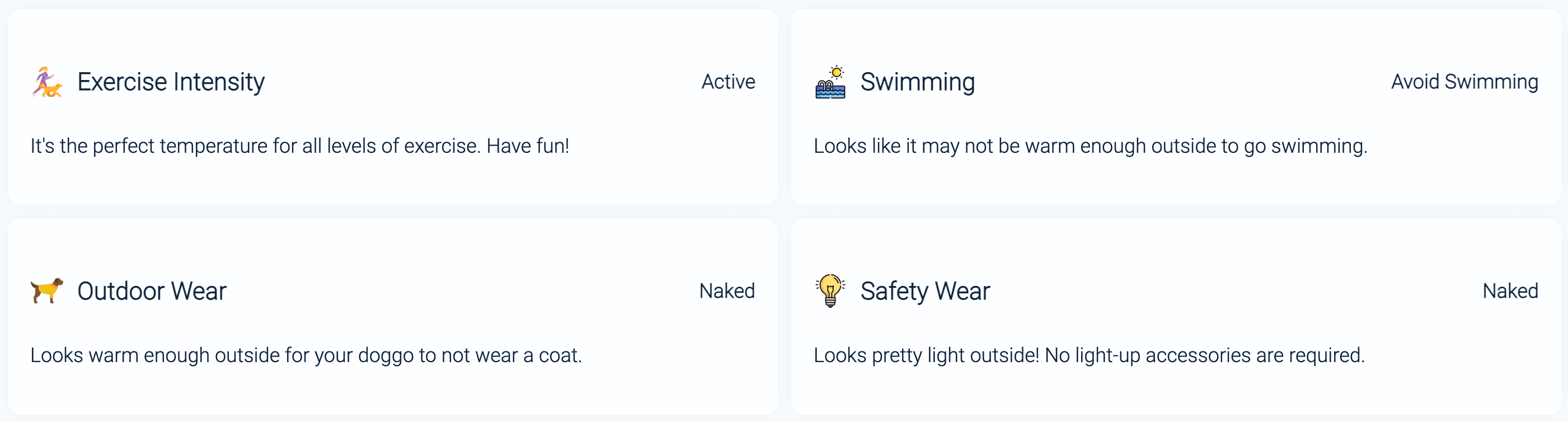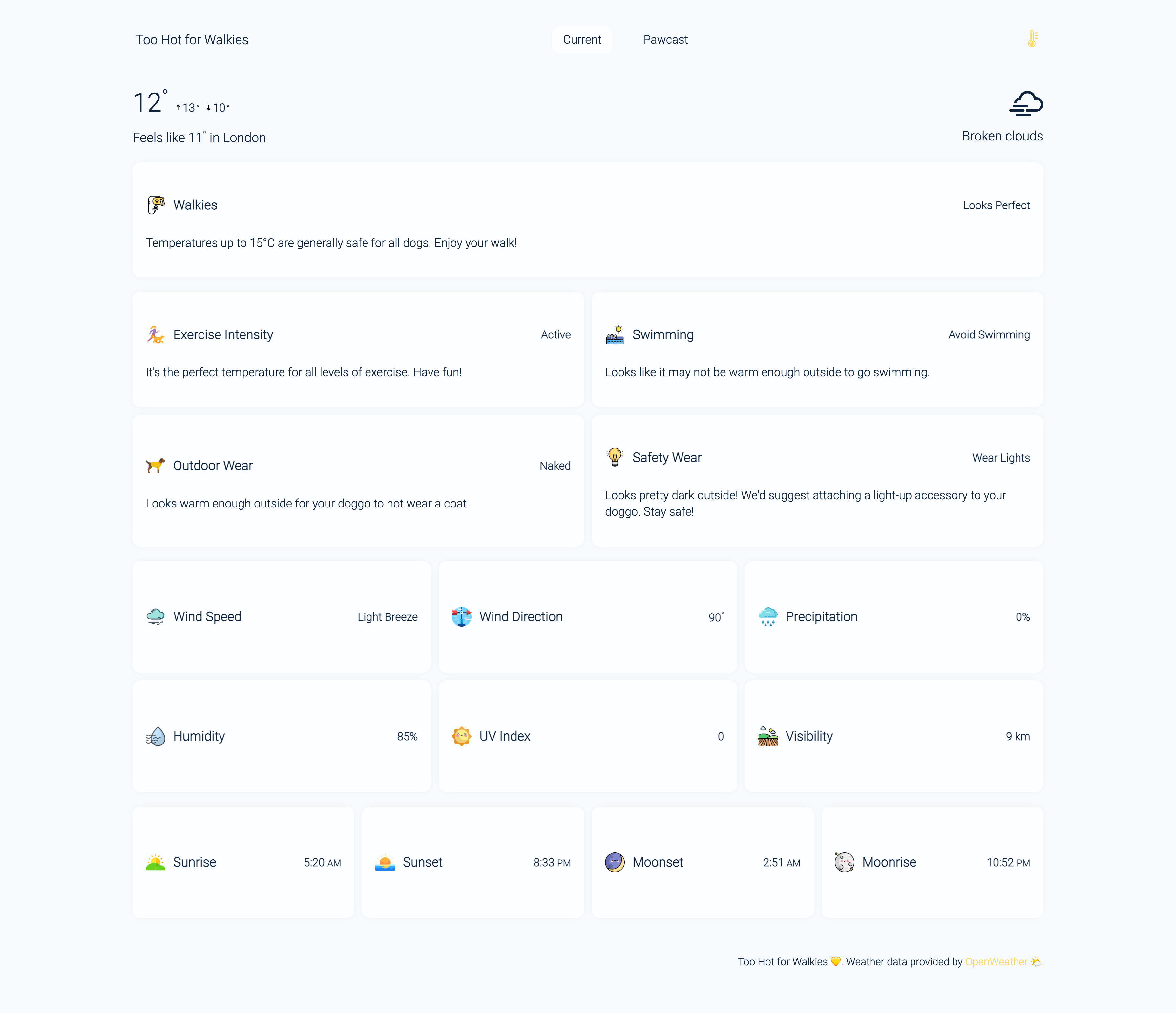 Insightful suggestions based upon the current and forecast weather to help you plan your walk with your doggo.